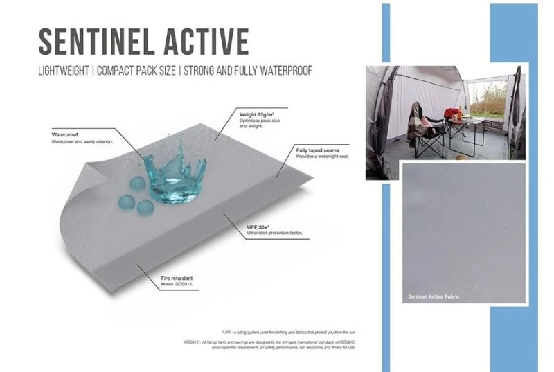 - Sentinel Active Fabric – When pack size and weight are the key influencers in choosing your awning, our specifically designed Sentinel Active fabric will surpass your needs. Sentinel Active is strong, whilst being fully waterproof with a rating of 3,000mm HH, ensuring great quality and performance coupled with compact pack sizes