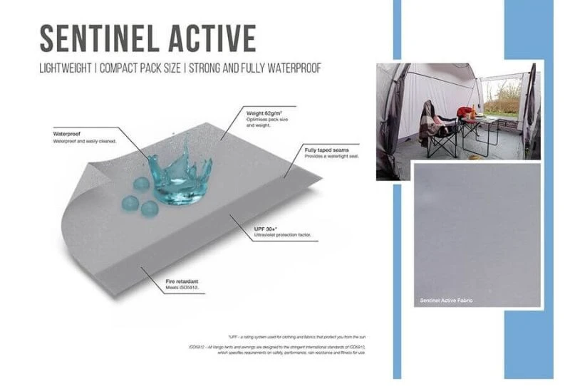 - Sentinel Active – When pack size and weight are the key influencers in choosing your awning, our specifically designed Sentinel Active fabric will surpass your needs. Sentinel Active is strong, whilst being fully waterproof, ensuring great quality and performance coupled with compact pack sizes.